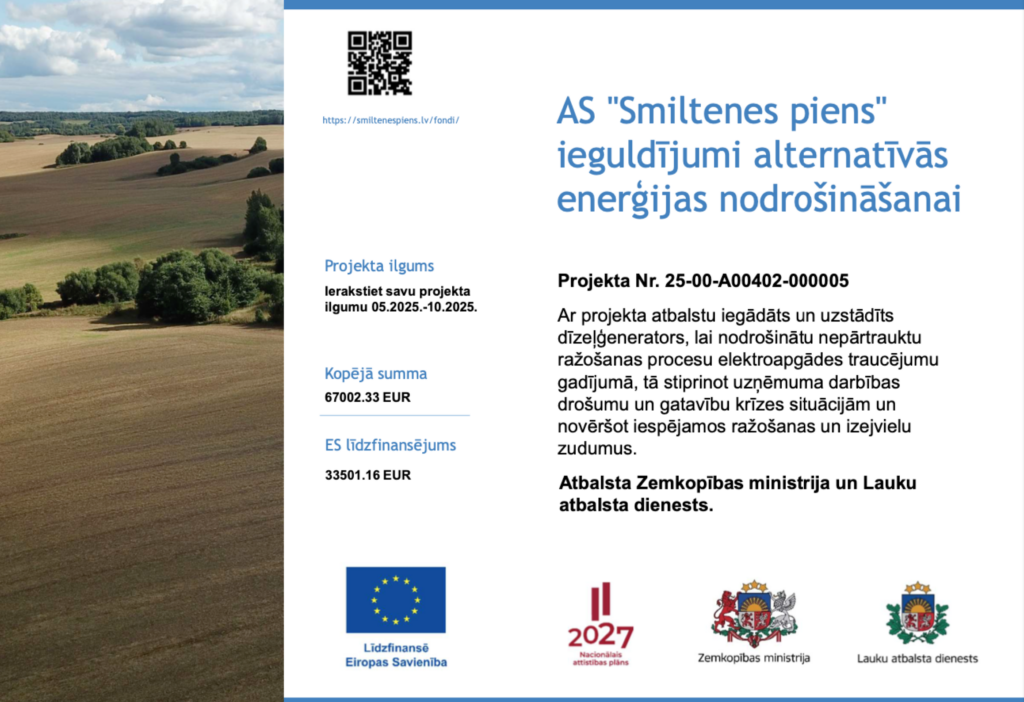 JSC Smiltenes piens has purchased a set of gates for milk reception, an electric elevator, a whey separation and cooling flow line for granular cottage cheese, a centralized washing system under the measure “Investments in tangible assets” of the European Agricultural Fund for Rural Development of the Latvian Rural Development Programme 2014-2020 sub-measure “Support for investments in processing” co-financed by the project No.22-00-A00402-000023.